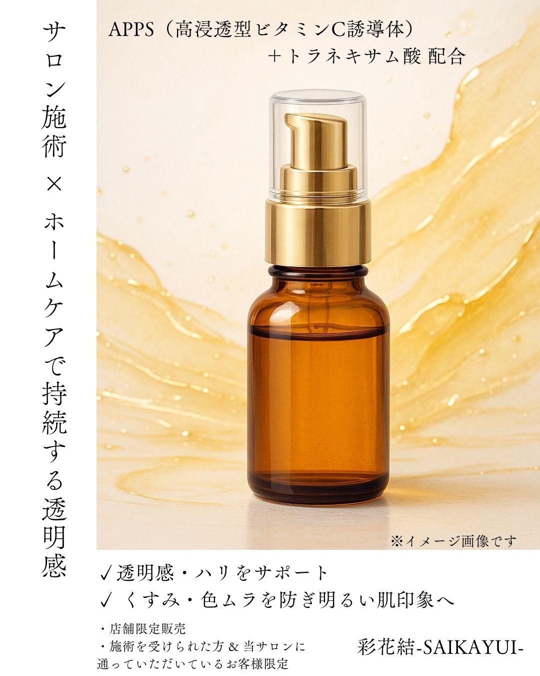 【施術を受けられた方限定・店舗販売美容液】 彩花結では、APPS+トラネキサム酸を配合した高機能導入美容液を、店舗限定で販売予定です。 ◆ご購入いただける方 :当サロンで肌質改善、薄毛施術を受けられた方(新規の方も含む)・当サロンに通っていただいているお客様 。施術直後にまずお試しいただき、その後ご希望の方に販売しております。※通販・郵送対応は行っておりません。ご予約・お問い合わせはLINEまたは店頭で承ります。 |
